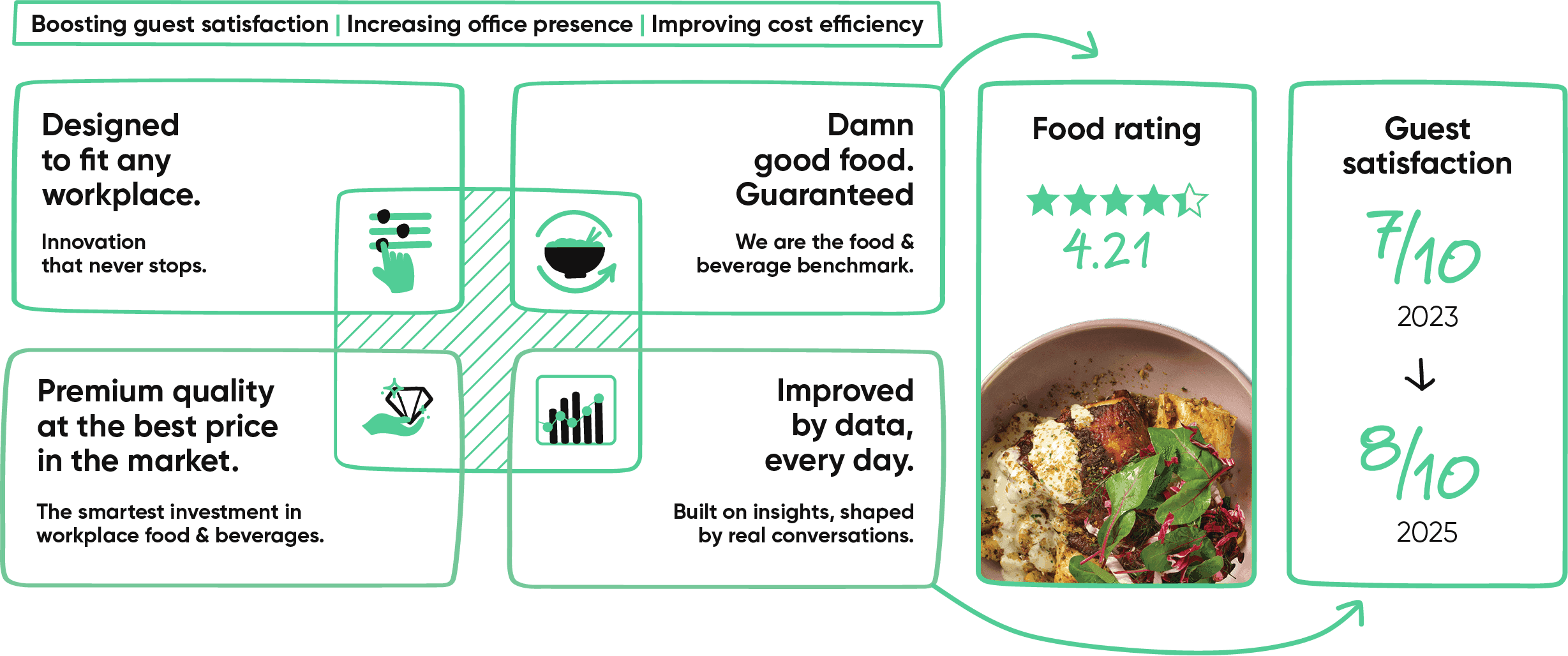 Eure Gewohnheiten und euer Feedback zählen. So werden Menüs, Abläufe und ESG-Wirkung ständig verbessert. Jede Entscheidung zählt. Und jeden Tag wird unser Service ein Stück besser. Von euch geprägt, durch eure Insights unterstützt.